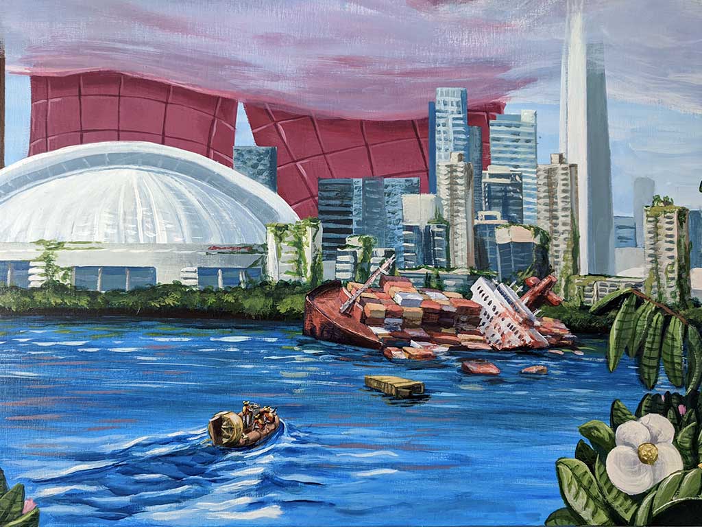Though known globally, the 1980’s Care Bear toys, cartoon shows and movie franchise has a strong Toronto history. The original 1985 Care Bears Movie was created in Toronto by Canadian animation studio Nelvana (their second feature film ever). It is also one of the first feature films based on a toy line. This work adds a modified giant Idol statue being built over the Toronto waterfront in a distant future after humans. Once again being built and explored by odd Visitors. There are a lot of small nods to the franchise and fun details to be found – but I’ll leave that up to you to find.
